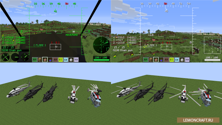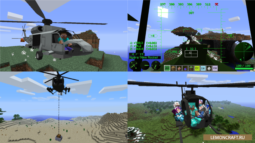 Вертолёты способны не только доставить вас в определённую точку, но и защитить. На борту расположены настоящие пулемёты и ракетницы. Если вы являетесь фанатом качественных дополнений и летательного транспорта, то непременно стоит скачать мод на вертолёты для Майнкрафт 1.7.10/1.7.2/1.6.4 - MCHeli и установить на клиент. В игру будет добавлен не только вертолёт, но и целых пять десятков летательных средств.